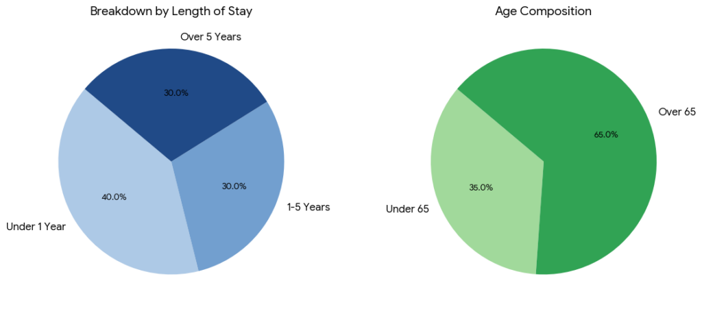 日本の精神科入院患者の状況は、「高齢化」と「長期化」が顕著なのが特徴。厚生労働省の統計(令和5年患者調査や精神保健福祉資料)に基づいた内訳。