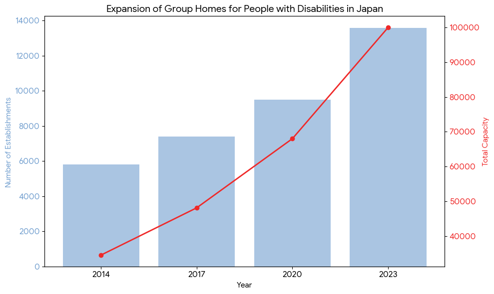 厚生労働省の「社会福祉施設等調査」などに基づくと、全国の「共同生活援助(グループホーム)」全体の規模は以下の通り推移している。※精神障害者単独の統計に加え、知的・身体障害者との共用型も含めた全体数として示されることが多い。