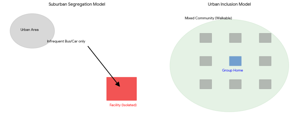 郊外型の大規模施設から地域移行しても、日中の通所先(作業所)がまた別の郊外にある場合、結局は「送迎車の中でのみ社会と接する」という「移動する分離」が発生している。